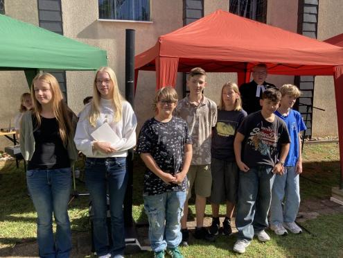 Obwohl der Samstag eine ungewöhnliche Zeit für einen Familiengottesdienst ist, waren schon um 11:00 Uhr alle verfügbaren Sitzgelegenheiten an den Tischen voll besetzt. Pfarrer Reinhardt Schellenberg stellte nach der Begrüßung die neuen Konfirmanden (siehe S. 28) vor. 19 junge Menschen werden auf die Konfirmation im Juni nächsten Jahres vorbereitet.