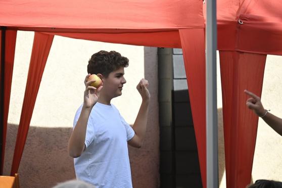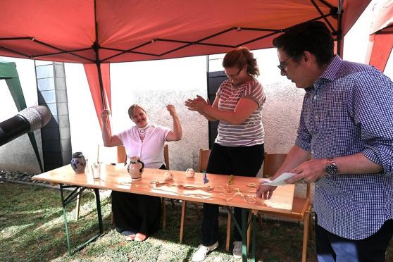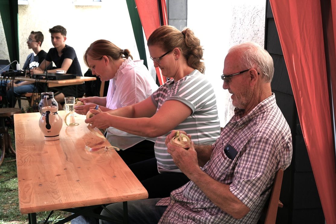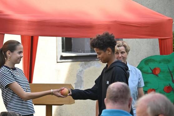 Mit der Begrüßung durch Thomas Milkowitsch begann das Nachmittagsprogramm. Er wies auf den Tag der Schöpfung hin und freute sich, dass „wir alle genießen, teilen und feiern dürfen“. Herzlich dankte er dem Festausschuss, dem Technik-Team (Levi und Levin) sowie den Konfirmanden und allen, die sich an der Organisation des Festes beteiligt hatten.Beim Unterhaltungsprogramm wurde viel geboten. Für eine Podiumsdiskussion begrüßte die Moderatorin (Kristel Neitsov-Mauer) als Experten eine Ärztin (Christa Spinczyk), einen Kirchenvertreter (Thomas Milko-witsch), einen Gelehrten (Charlotte Weißenberger) und einen Poeten (Peter Schilling). Von ihnen konnten die Gäste allerhand Neues zum malus domestica (Hausapfel) erfahren.Nach einem Lied für alle Gemeindemitglieder schloss sich die Jugend-gruppe (siehe S. 16) mit einer Pantomime an. Sie stellten verschiedene Begriffe dar, die das Publikum erraten musste. Wilhelm Tell, Adam und Eva, Newton und Schneewittchen waren dank der geschickten Darstellung schnell erraten. Beim Apfelquiz wurden die Gäste tischweise in Teams aufgeteilt. Für diejenigen, die aufmerksam das Geschehen verfolgt hatten, waren die Fragen nicht sehr schwer zu beantworten und so gab es mehrere Gruppen, die richtig lagen. Der Preis (Apfelkekse, Apfeltee, Cidre…) wurde ausgelost. Das Bembelstemmen war definitiv zu leicht. Von den vier Kandidaten machte keiner schlapp. Alle konnten den mit einem Liter Wasser gefüllten Bembel für eine geraume Zeit in der Waagerechten halten und das Turnier endete unentschieden. Beim Quiz „um die Ecke denken“ musste man Begriffe erraten, die alle mit dem Apfel zu tun haben: Augapfel, Reichsapfel, Pferdeapfel, Zankapfel, Adamsapfel und Granatapfel. Bei der Erzeugung einer langen Apfelschalen-Schlange durch das Schälen eines Apfels konnte keiner die Leistung von Kristel Neitsov-Mauer toppen, sehr konzentriert schälte sie bis zum Sieg.