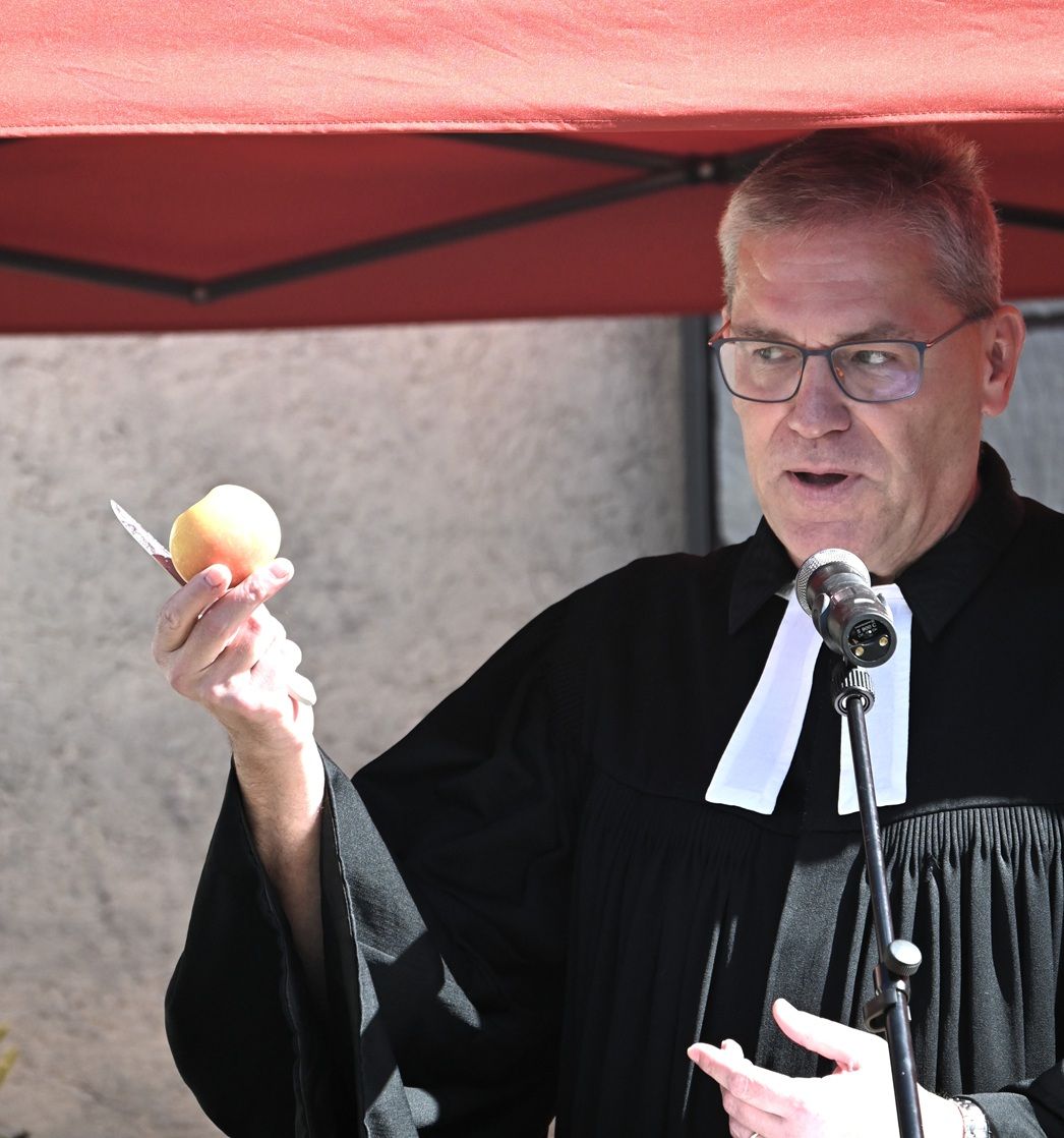 Das Zitat von Martin Luther „Wenn ich wüsste, dass morgen die Welt unterginge, würde ich noch heute ein Apfelbäumchen pflanzen“ kann man als Hoffnung und Perspektive der Christen ansehen. „Insgesamt findet man nur sechs Bibelstellen, in denen der Apfel erwähnt wird“, so Pfarrer Schellenberg, „und davon sind vier im Hohelied der Liebe.“ Anschaulich präsentierte der Pfarrer den Unterschied zwischen einer Zwiebel, die aus vielen gleichen Schichten besteht, und einem Apfel mit seinem Kern, indem er beide schälte. Auf den Kern käme es an, auch im Glauben, das ist seine Botschaft an die Gemeinde.