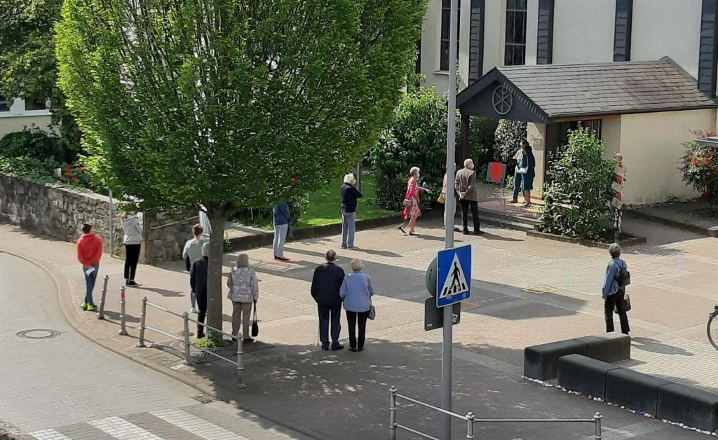 Warteschlange mit Abstand vor der Auferstehungskirche während der Corona-Pandemie 2020